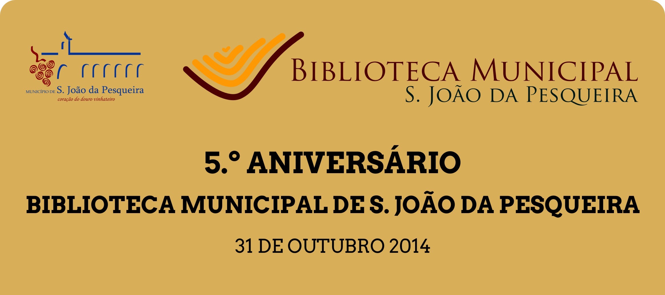 Inicial 5º Aniversário da Biblioteca Municipal de S. João da Pesqueira 5º Aniversário da Biblioteca Municipal de S. João da Pesqueira 15 Set Venha participar no 5.º Aniversário da Biblioteca Municipal de S. João da Pesqueira, no dia 31 de Outubro (sexta-feira), a partir das 18:00. Consulte o programa em baixo: Voltar