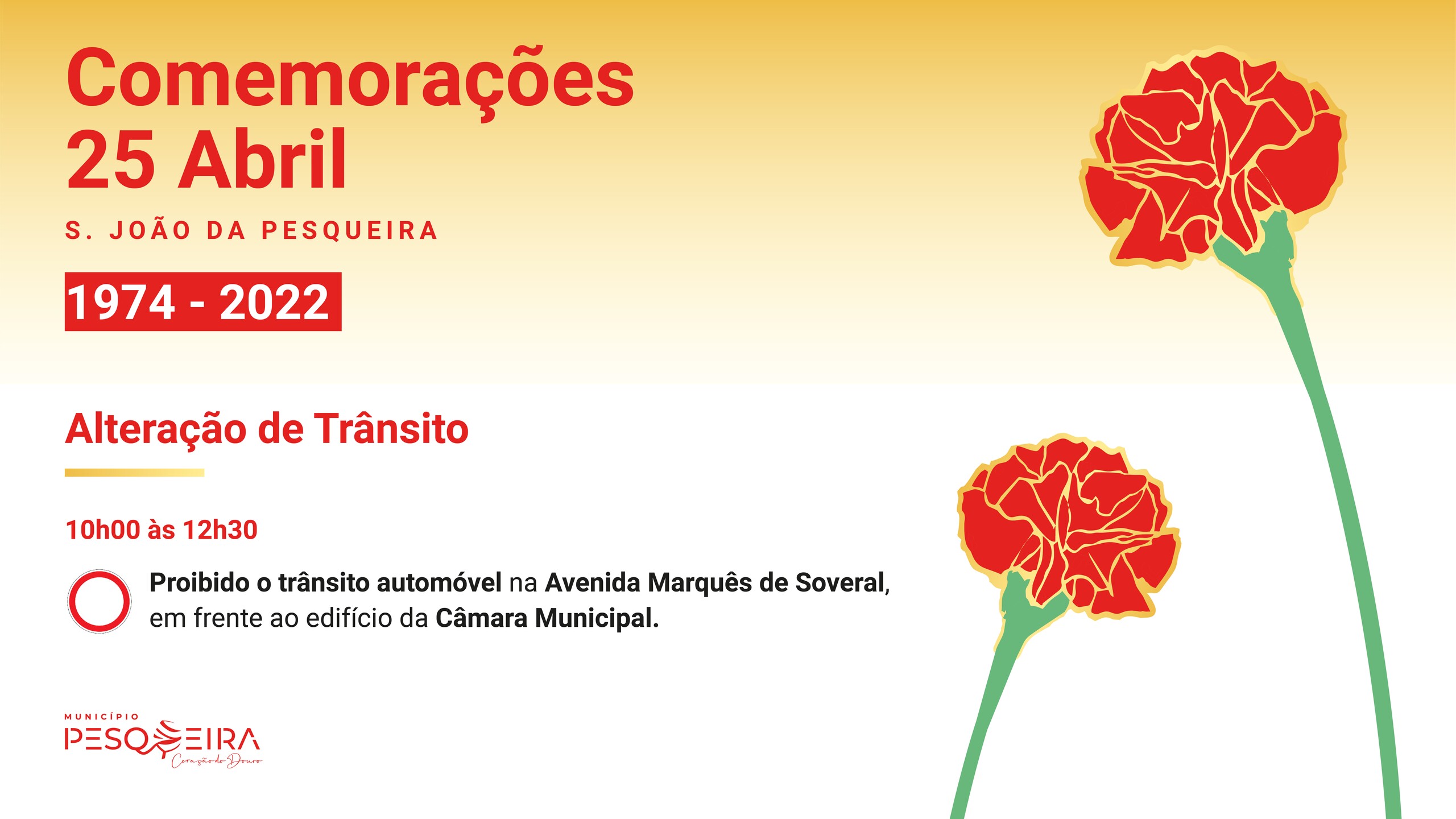 Inicial ALTERAÇÃO AO TRÂNSITO - COMEMORAÇÕES DO 25 DE ABRIL ALTERAÇÃO AO TRÂNSITO - COMEMORAÇÕES DO 25 DE ABRIL 20 Abr O Município de S. João da Pesqueira torna público o seguinte edital: Voltar