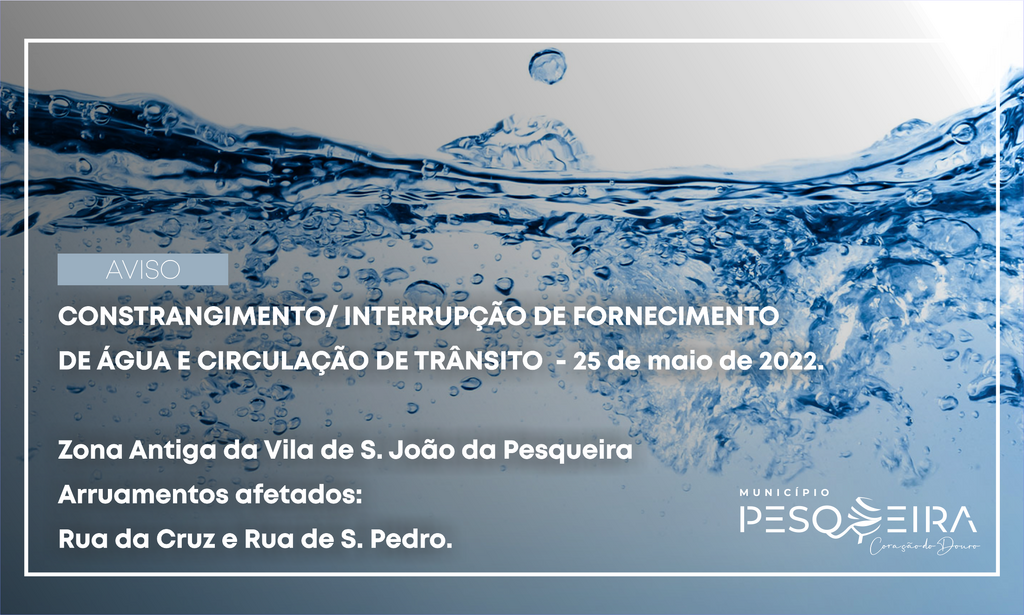 Inicial AVISO | CONSTRANGIMENTO/ INTERRUPÇÃO DE FORNECIMENTO DE ÁGUA E CIRCULAÇÃO DE TRÂNSITO AVISO | CONSTRANGIMENTO/ INTERRUPÇÃO DE FORNECIMENTO DE ÁGUA E CIRCULAÇÃO DE TRÂNSITO 23 Mai O Município de S. João da Pesqueira torna público o seguinte aviso: Voltar