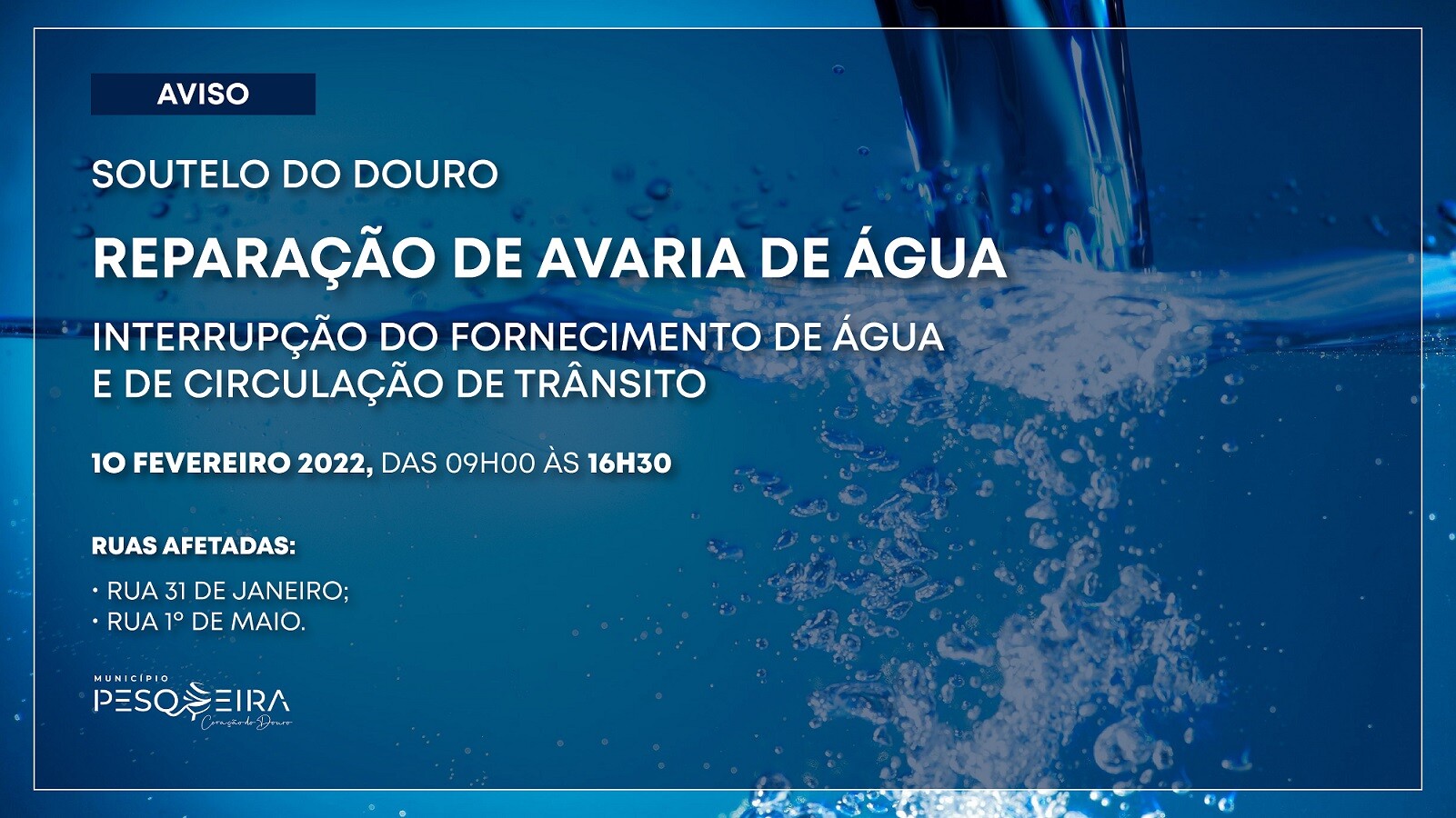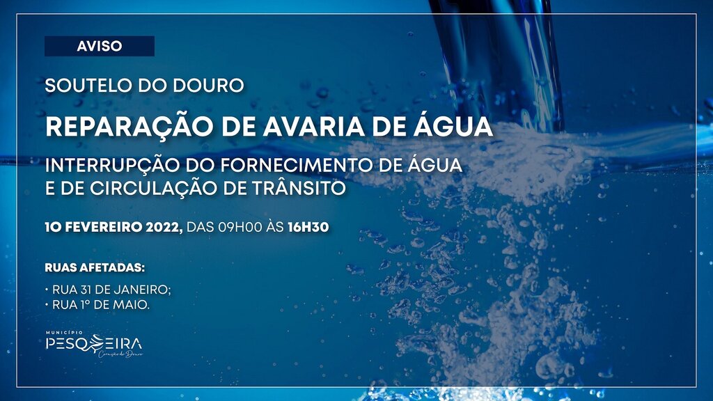 Inicial AVISO | INTERRUPÇÃO DO FORNECIMENTO DE ÁGUA E DE CIRCULAÇÃO DE TRÂNSITO AVISO | INTERRUPÇÃO DO FORNECIMENTO DE ÁGUA E DE CIRCULAÇÃO DE TRÂNSITO 09 Fev O Município de S. João da Pesqueira torna público o seguinte aviso: Voltar