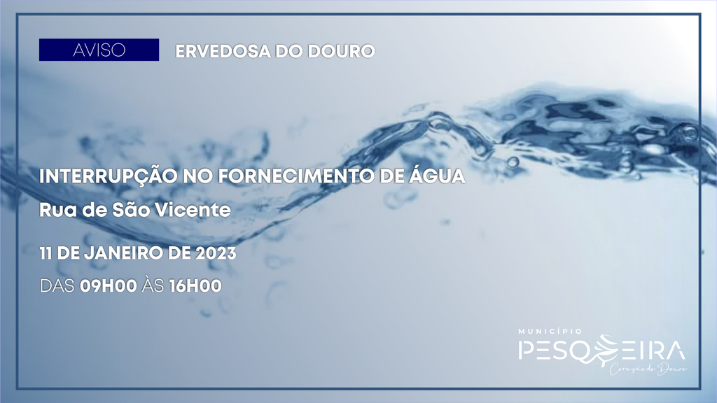 Inicial AVISO | INTERRUPÇÃO DO FORNECIMENTO DE ÁGUA | ERVEDOSA DO DOURO AVISO | INTERRUPÇÃO DO FORNECIMENTO DE ÁGUA | ERVEDOSA DO DOURO 10 Jan O Município de S. João da Pesqueira torna público o seguinte aviso: Voltar