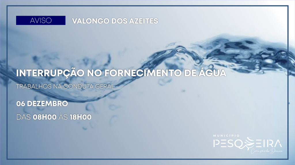 Inicial AVISO | INTERRUPÇÃO NO FORNECIMENTO DE ÁGUA | VALONGO DOS AZEITES AVISO | INTERRUPÇÃO NO FORNECIMENTO DE ÁGUA | VALONGO DOS AZEITES 05 Dez O Município de S. João da Pesqueira torna público o seguinte aviso: Voltar