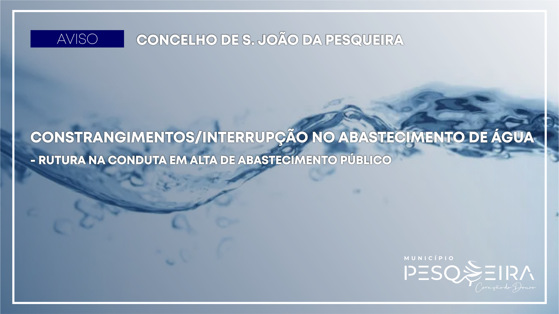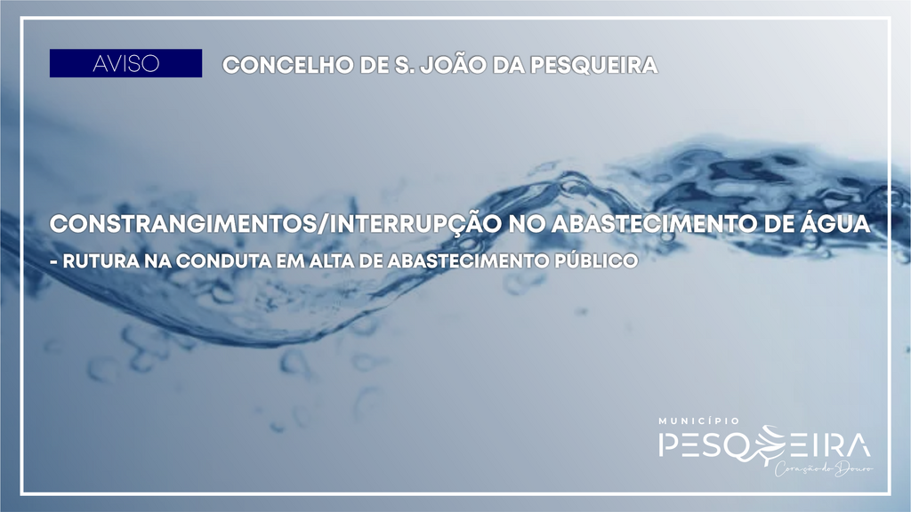 Inicial AVISO | RUTURA NA CONDUTA EM ALTA DE ABASTECIMENTO PÚBLICO | INTERRUPÇÃO NO FORNECIMENTO DE ÁGUA - CONCELHO DE SÃO JOÃO DA PESQUEIRA AVISO | RUTURA NA CONDUTA EM ALTA DE ABASTECIMENTO PÚBLICO | INTERRUPÇÃO NO FORNECIMENTO DE ÁGUA - CONCELHO DE SÃO JOÃO DA PESQUEIRA 27 Jan O Município de S. João da Pesqueira torna público o seguinte aviso: Voltar