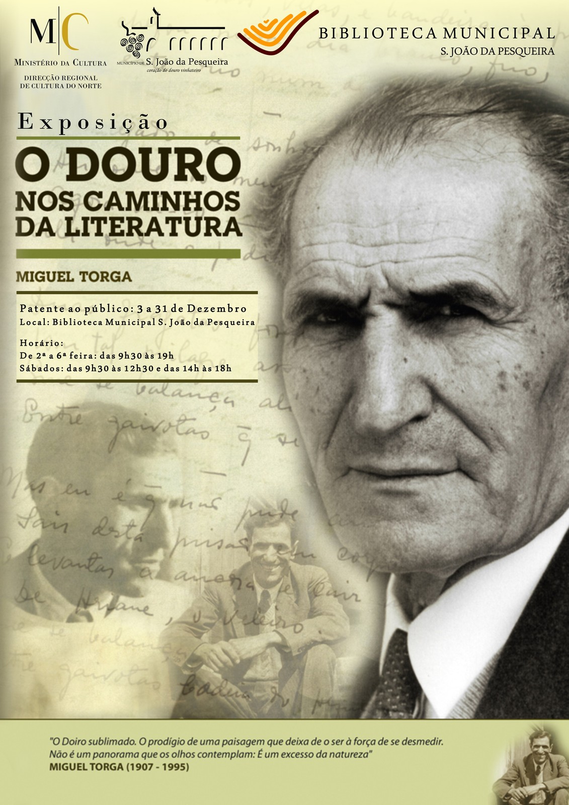 Inicial Exposição: O Douro nos Caminhos da Literatura - "Miguel Torga" Exposição: O Douro nos Caminhos da Literatura - 'Miguel Torga' 04 Dez Patente ao público: 3 a 31 de Dezembro Local: Biblioteca Municipal S. João da Pesqueira Horário: De 2ª a 6ª feira: das 9h30 às 19hSábados: das 9h30 às 12h30 e das 14h às 18h Cartaz | Exposição "O Douro nos Caminhos da Literatura - "Miguel Torga" Voltar