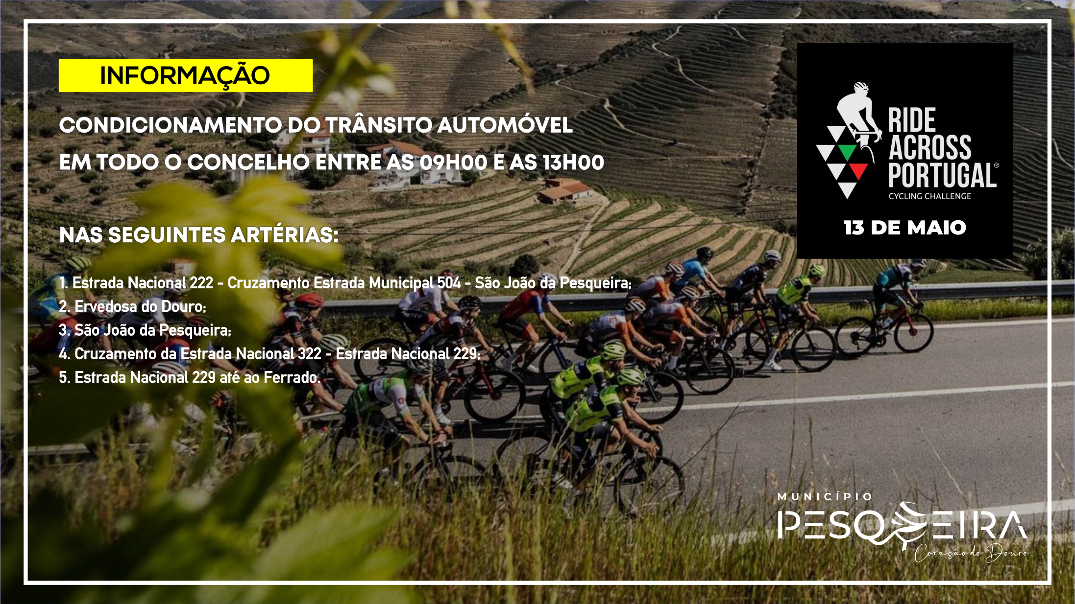 INFORMAÇÃO | 6.ª EDIÇÃO DO EVENTO RIDE ACROSS PORTUGAL :: TRÂNSITO AUTOMÓVEL CONDICIONADO EM TODO O CONCELHO ENTRE AS 09H00 E AS 13H00 DO DIA 13 DE MAIO