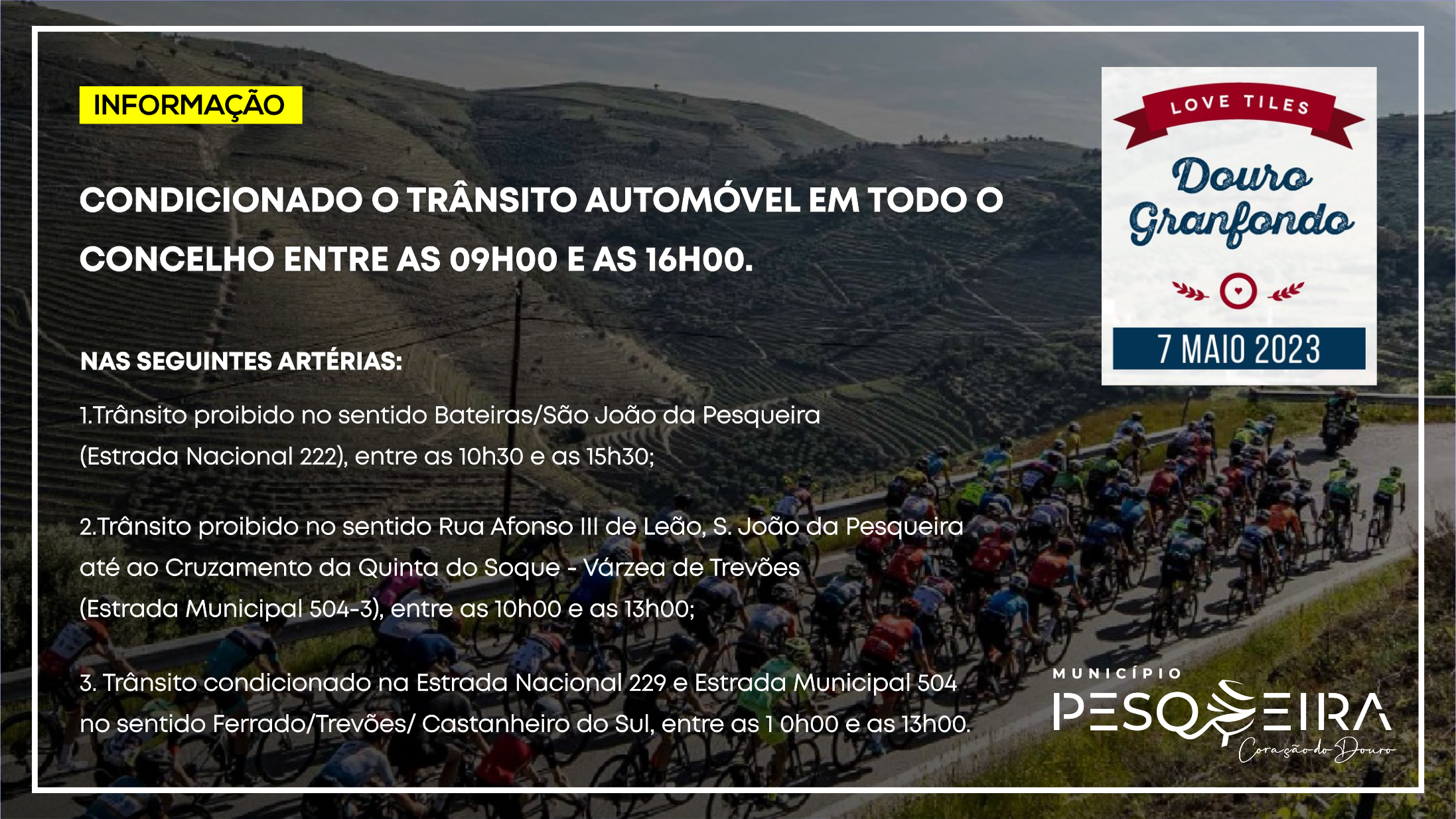 Inicial INFORMAÇÃO | 8.ª EDIÇÃO DO DOURO GRANFONDO :: TRÂNSITO AUTOMÓVEL CONDICIONADO EM TODO O CONCELHO ENTRE AS 09H00 E AS 16H00 DO DIA 7 DE MAIO INFORMAÇÃO | 8.ª EDIÇÃO DO DOURO GRANFONDO :: TRÂNSITO AUTOMÓVEL CONDICIONADO EM TODO O CONCELHO ENTRE AS 09H00 E AS 16H00 DO DIA 7 DE MAIO 01 Mai O Município de S. João da Pesqueira torna público o seguinte edital: Voltar