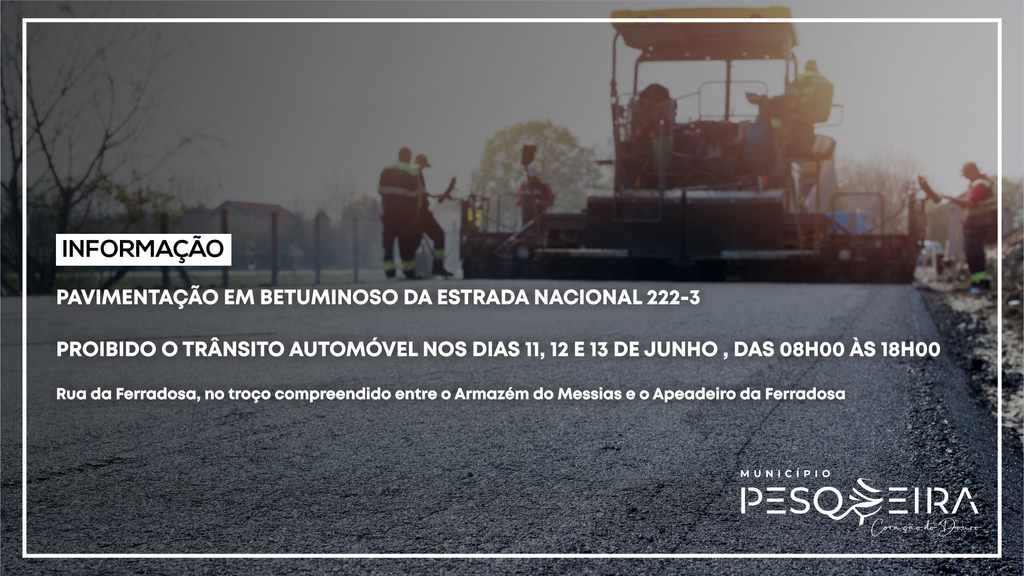 Inicial INFORMAÇÃO | PAVIMENTAÇÃO EM BETUMINOSO DA ESTRADA NACIONAL 222-3 - RUA DA FERRADOSA :: ARMAZÉM MESSIAS <-> APEADEIRO FERRADOSA INFORMAÇÃO | PAVIMENTAÇÃO EM BETUMINOSO DA ESTRADA NACIONAL 222-3 - RUA DA FERRADOSA :: ARMAZÉM MESSIAS <-> APEADEIRO FERRADOSA 06 Jun O Município de S. João da Pesqueira torna público o seguinte edital: Voltar