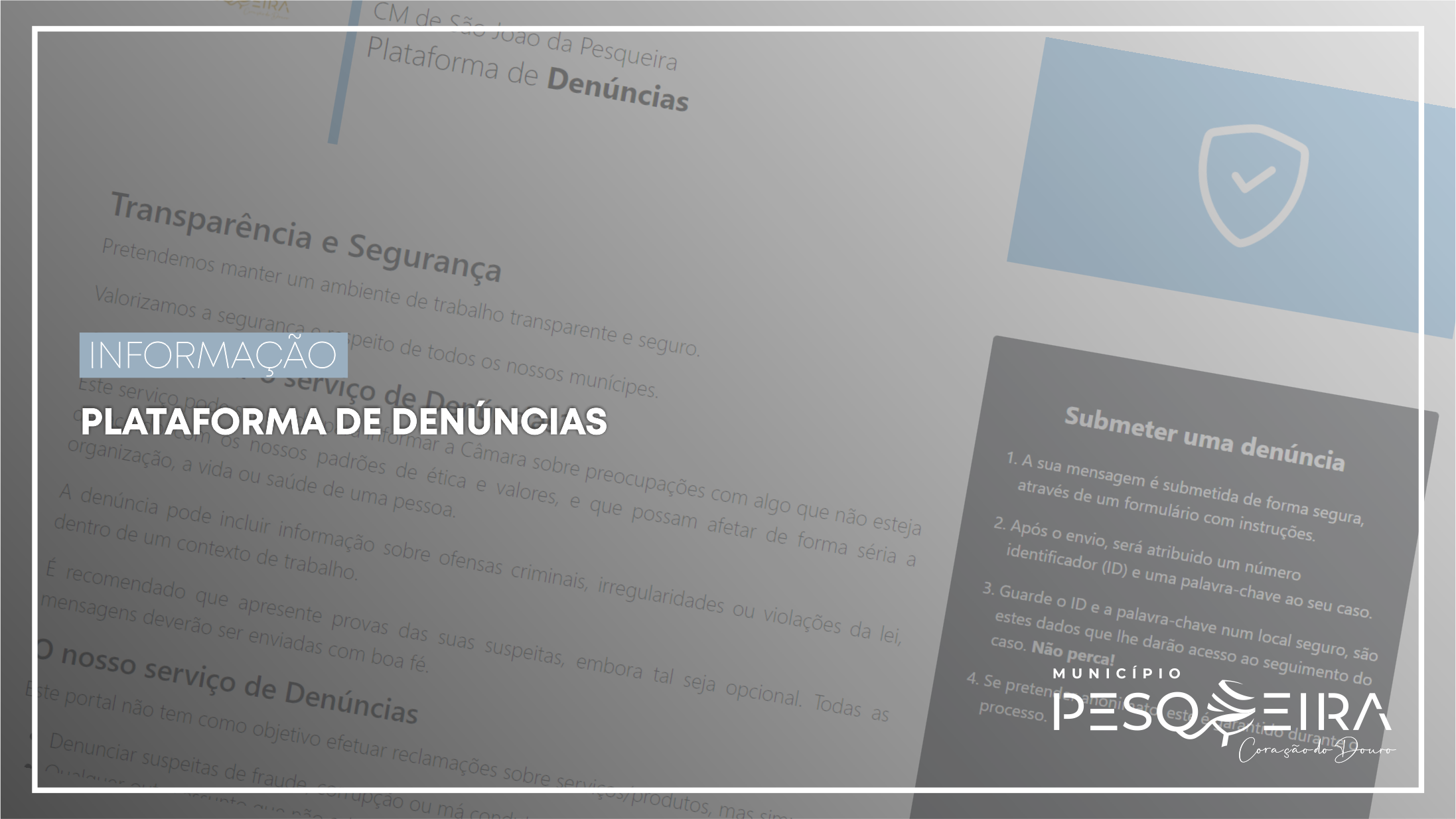 Em cumprimento da Lei n.º 93/2021, de 20 de dezembro, que estabelece o regime geral de proteção de denunciantes de infrações, o município de S. João da Pesqueira já dispõe de um canal específico para que as denúncias possam ser feitas, garantindo a segurança e anonimato dos denunciantes.
