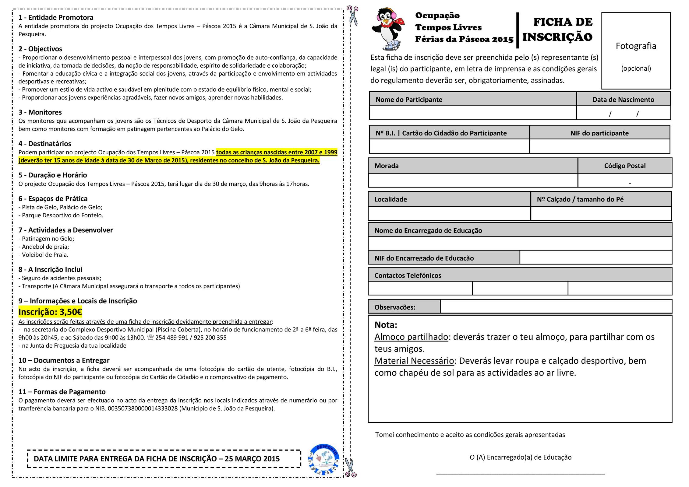 As inscrições serão feitas através de uma ficha de inscrição devidamente preenchida a entregar: