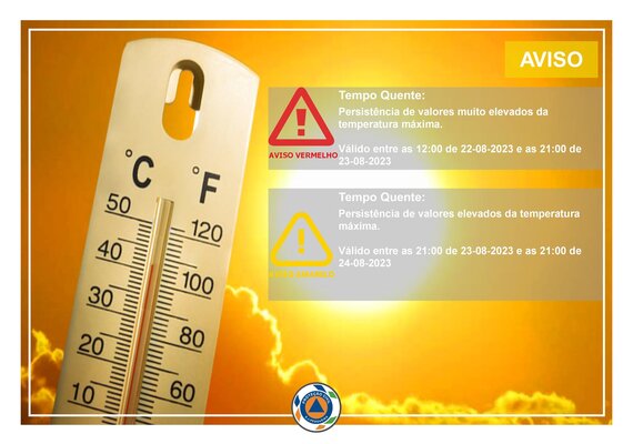 ⚠️Aviso Vermelho IPMA: TEMPO QUENTE ☀️ 🔥Persistência de valores muito elevados da temperatura máxima. Válido entre as 12:00 ...Serviços - Proteção Civil - Avisos e Informações -