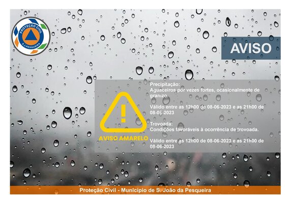 Aviso Amarelo IPMA: Precipitação e Trovoada Precipitação: Aguaceiros por vezes fortes, ocasionalmente de granizo. Válido ...Serviços - Proteção Civil - Avisos e Informações
