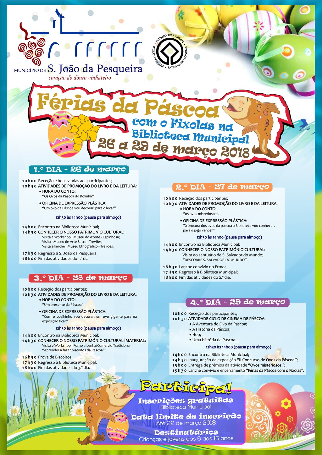 O Municipio de S. João da Pesqueira promove de 26 a 29 de Março, a atividade “Férias da Páscoa com o Fixolas”, dirigida a todas as crianças e jovens do Concelho, dos 6 aos 15 anos.