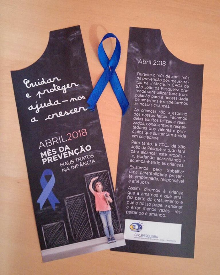 Em 2018, como forma simbólica de divulgação do lema “Cuidar e proteger, ajuda-nos a crescer”, distribuímos pela comunidade material alusivo ao longo do mês de abril, mês da prevenção dos Maus Tratos na Infância. Desses materiais destacamos os marcadores de livros. Que estes sejam úteis, não só para marcar livros, mas também consciências.