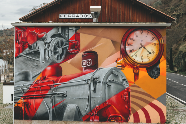 Mural inspirado na antiga locomotiva a vapor que outrora percorreu as margens do Douro, simbolizando o ritmo do tempo e a ...Comboio do Tempo