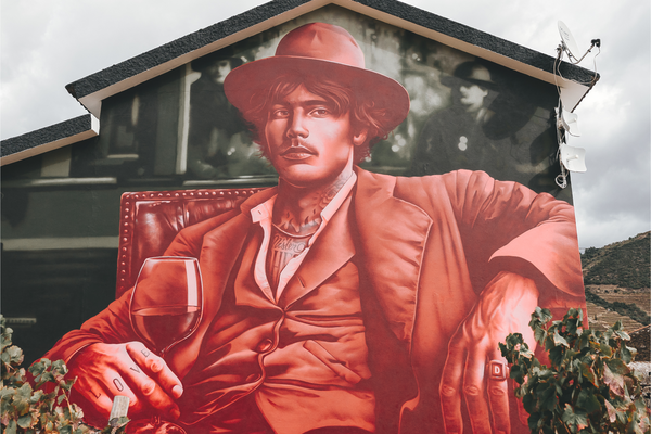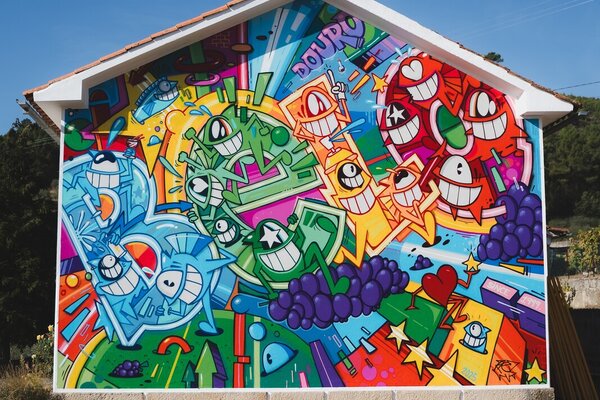 Mural que retrata um jovem a saborear as uvas típicas do Douro, envolvido por um arco-íris vibrante e flores exuberantes. Uma ...Doce Douro