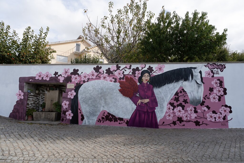 Este mural é inspirado na figura de Guiomar, uma das mulheres mais antigas da aldeia e conhecida por caminhar diariamente com o seu cavalo. A obra celebra a força, a simplicidade e a generosidade das gentes do Alto Douro, numa paisagem marcada por vinhas, oliveiras e amendoeiras.