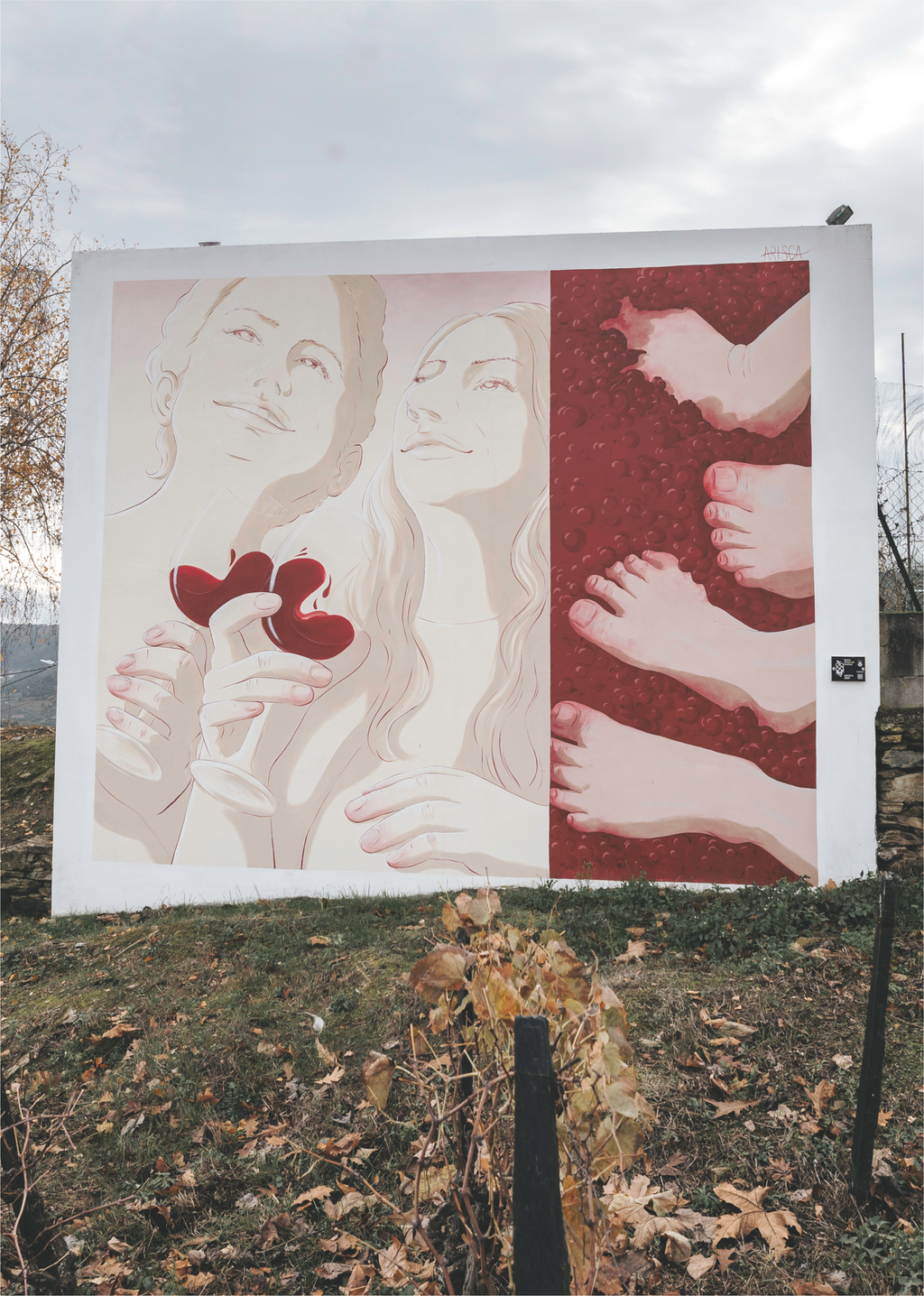 Este mural nasce entre vinhedos, local onde todo o processo tem início. A obra está dividida em dois momentos ímpares, a pisa da uva e o momento da degustação do vinho. Em ambas as imagens estão representadas duas pessoas retratando assim a união, partilha e a celebração do vinho e da região.