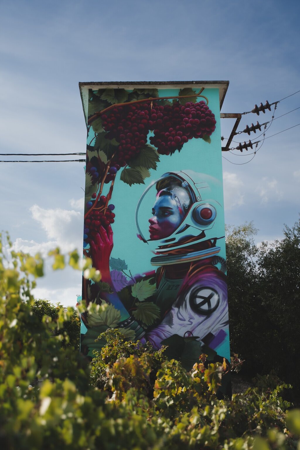 Mural que imagina um futuro distante onde a humanidade coloniza outros mundos, levando consigo o legado cultural e técnico do Douro. A figura futurista em trajes espaciais simboliza a continuidade da viticultura duriense, representando o papel dos polifenóis e do vinho como elementos essenciais de identidade, tradição e convivência — mesmo além da Terra.