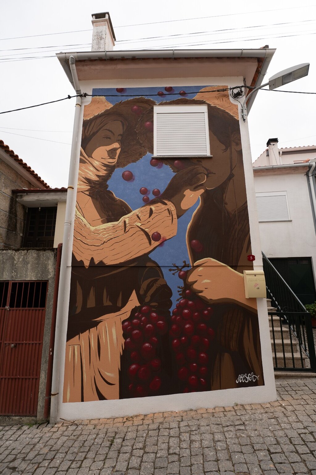 Mural que retrata um gesto íntimo e romântico entre duas figuras, onde uma mulher oferece uvas ao seu companheiro, um momento simples mas profundamente ligado ao quotidiano das vindimas no Douro. A obra celebra a ternura, a partilha e a cumplicidade que florescem entre as vinhas, refletindo a ligação afetiva das pessoas com a terra e com os rituais agrícolas que definem a vida duriense.