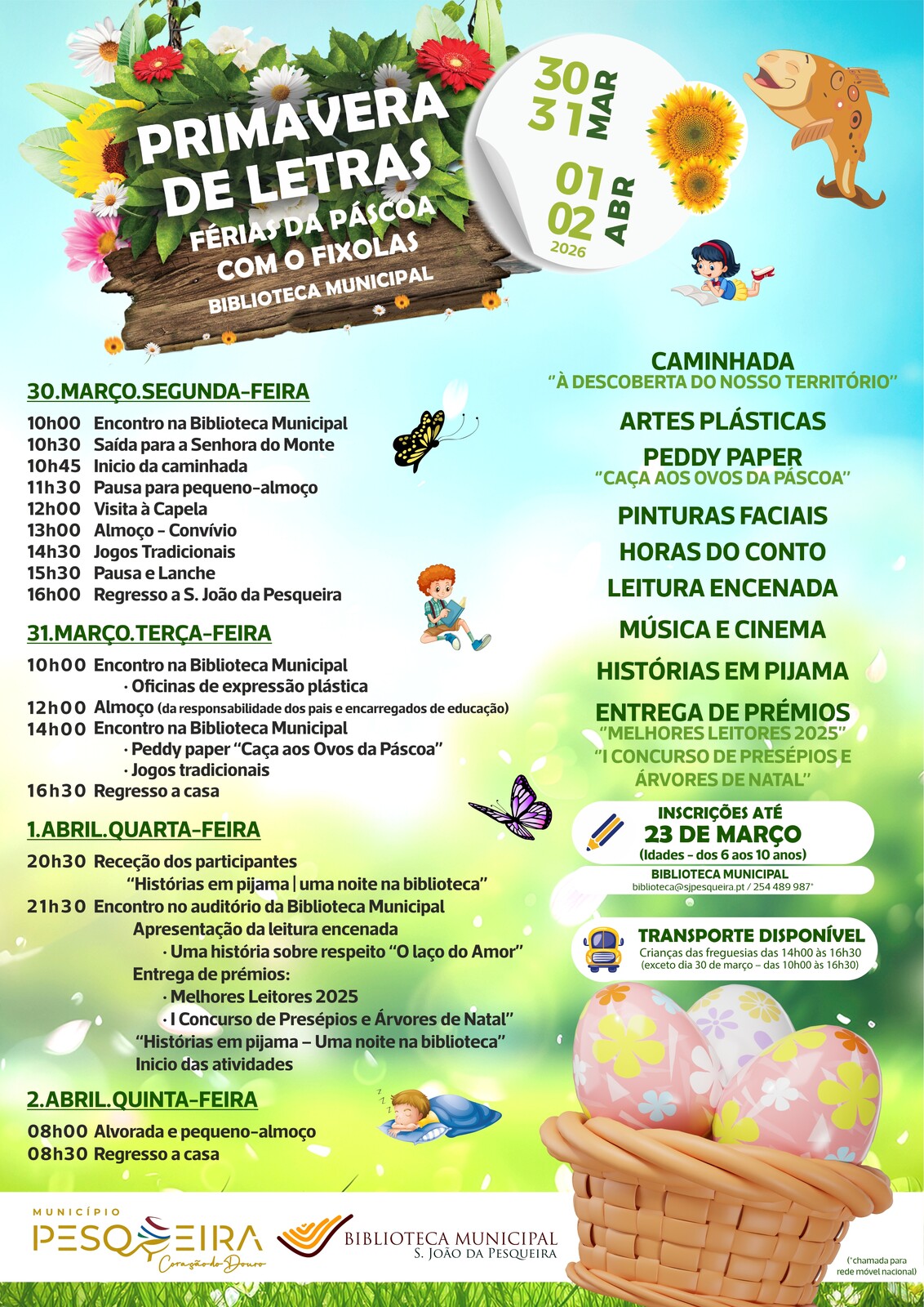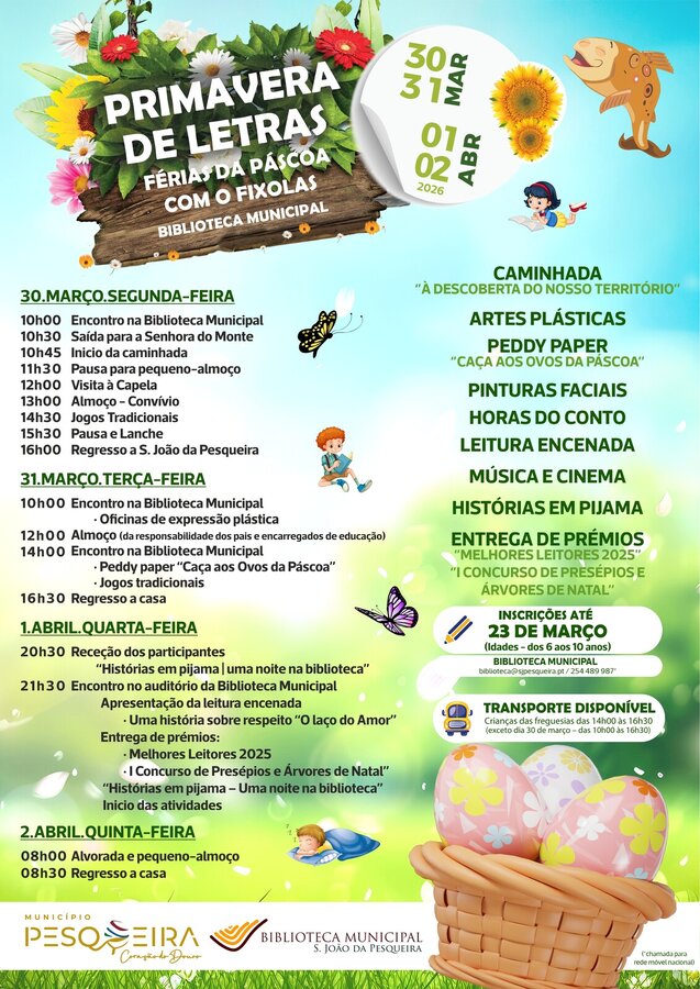 O Município de S. João da Pesqueira promove, de 30 de março a 2 de abril, a atividade Primavera de Letras | Férias da Páscoa com o Fixolas, na Biblioteca Municipal.