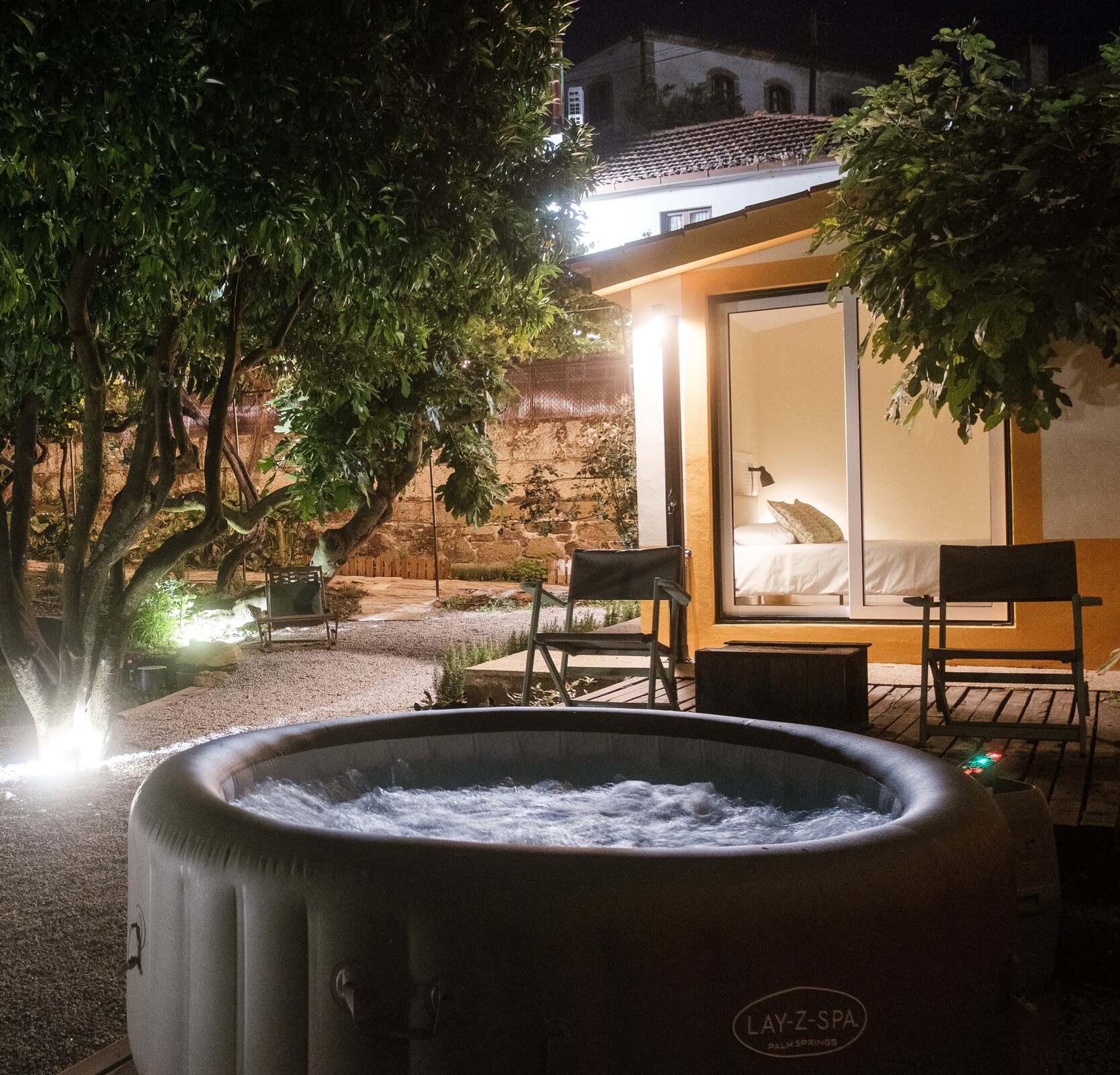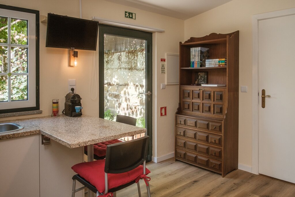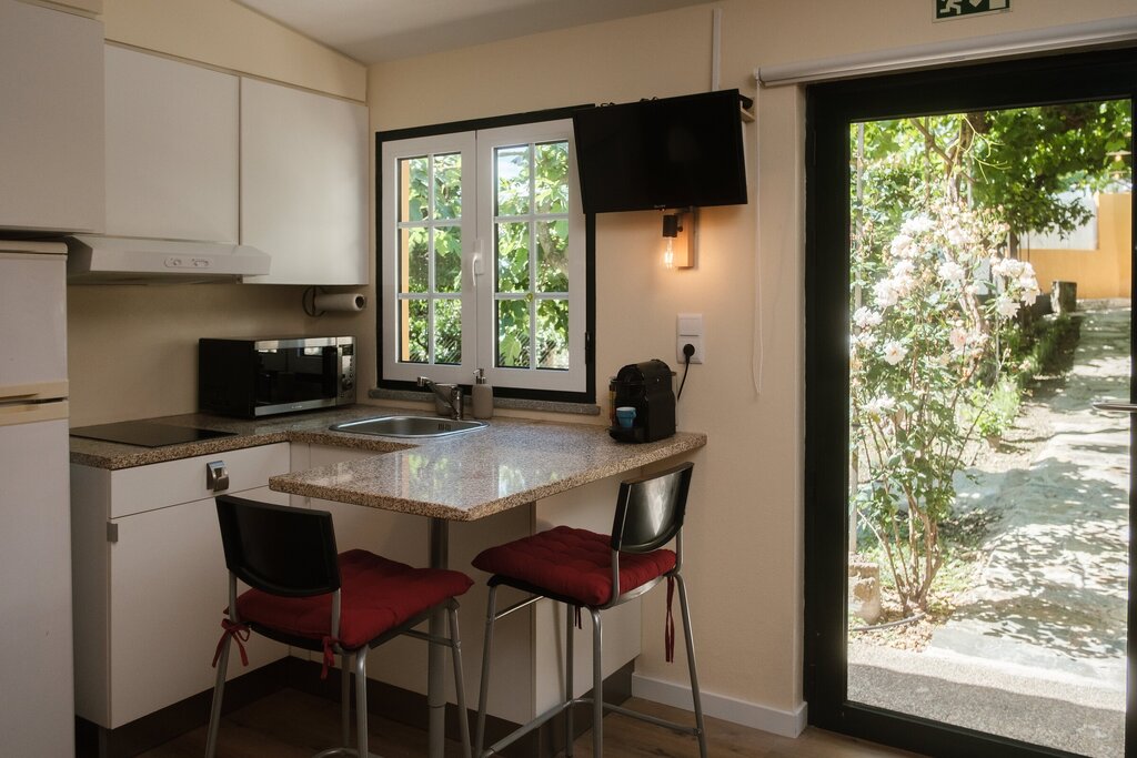 A casa conta com uma sala e cozinha conjuntas. Na sala você pode relaxar e desfrutar da TV e a cozinha kitchenette está totalmente equipada e tem uma área de jantar para que possa preparar e experimentar os sabores tradicionais portugueses. Próximo deste espaço encontrará uma casa de banho completa. Inclui ainda um quarto com uma cama queen size e acesso direto ao exterior através de uma porta de vidro que lhe proporcionará uma vista privilegiada sobre os vinhedos. No exterior encontrará um jacuzzi, zona de relvado, cantinho de ervas aromáticas, ramada com vinha velha e um pequeno laranjal.